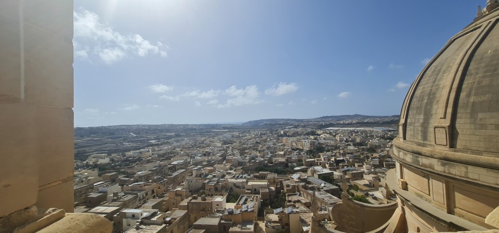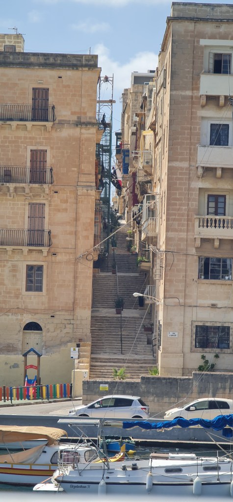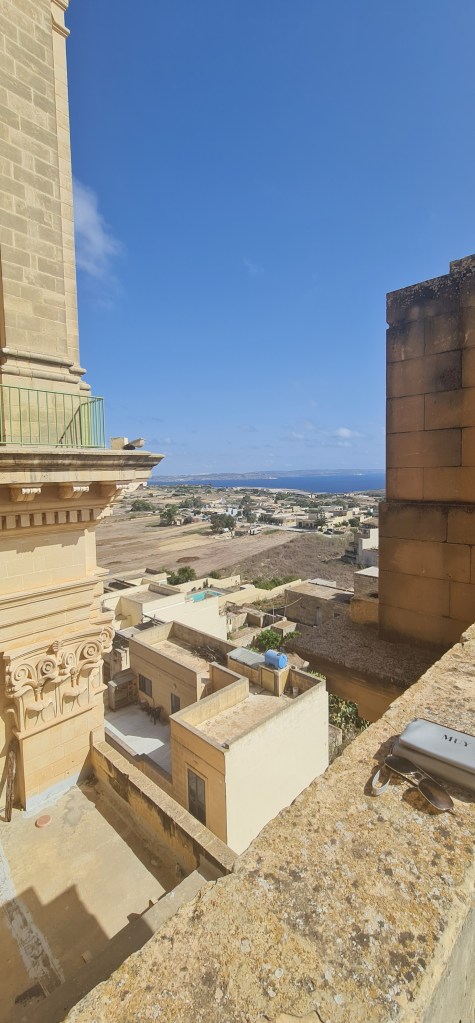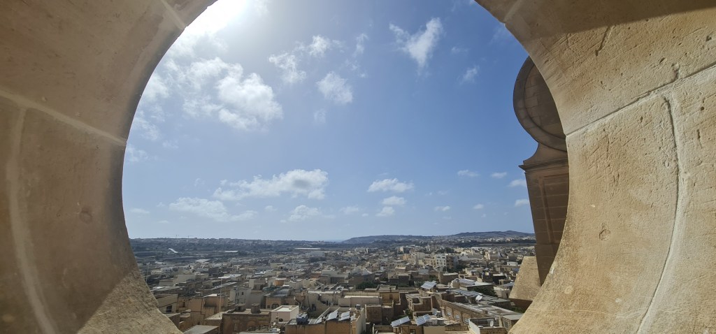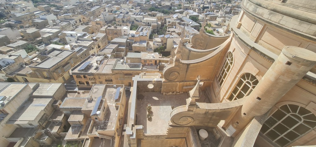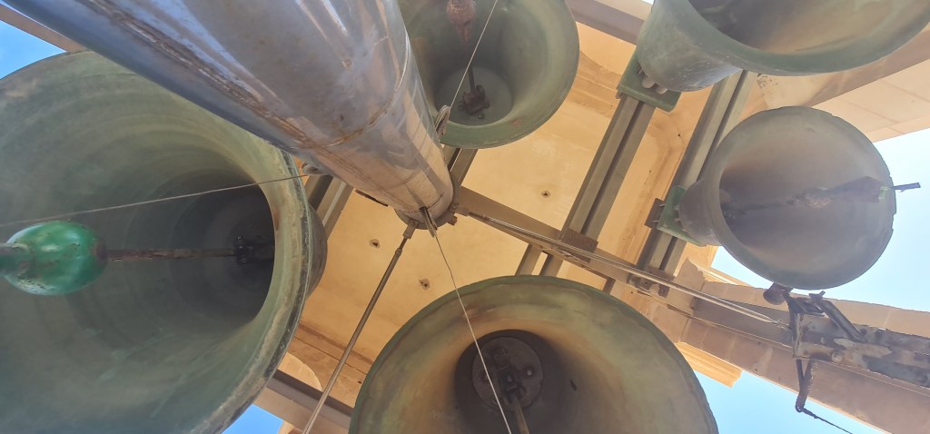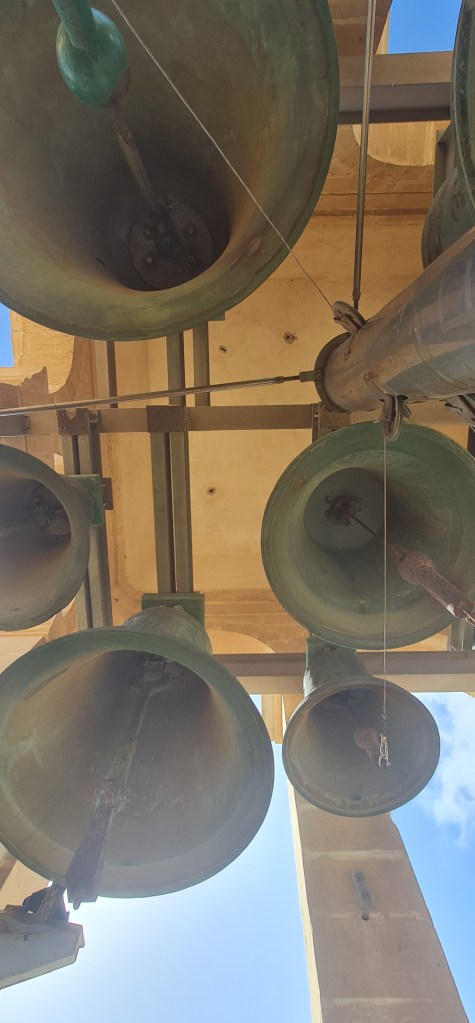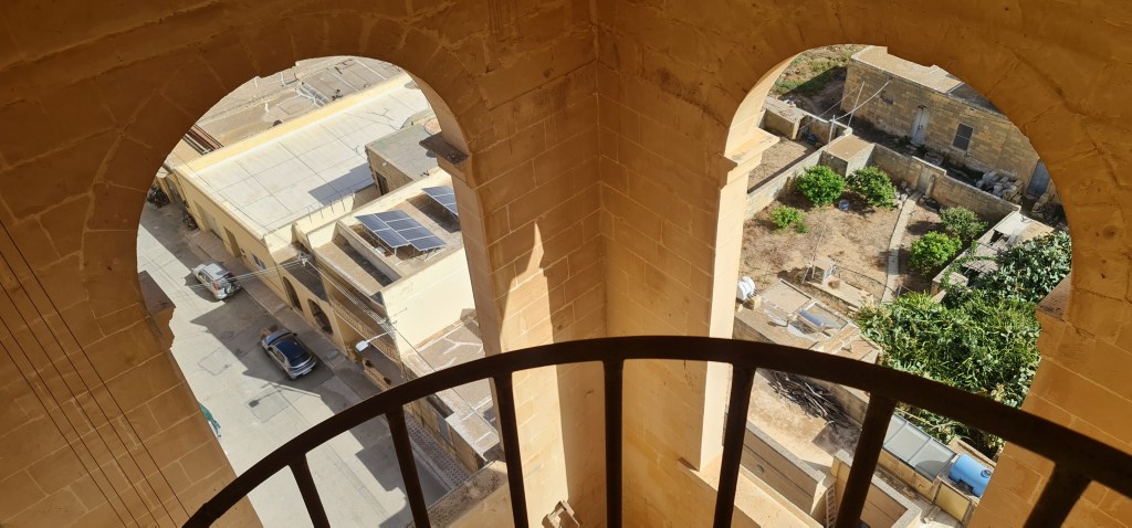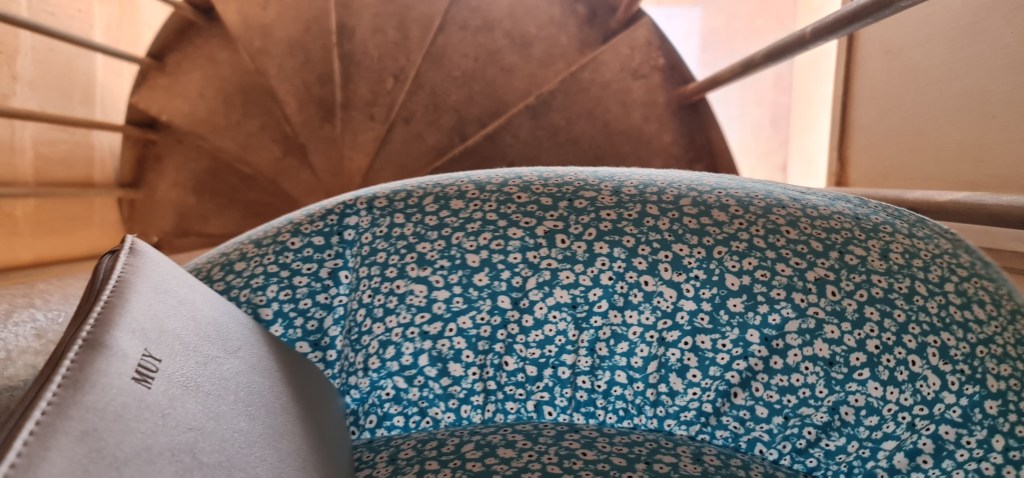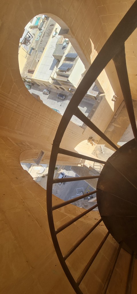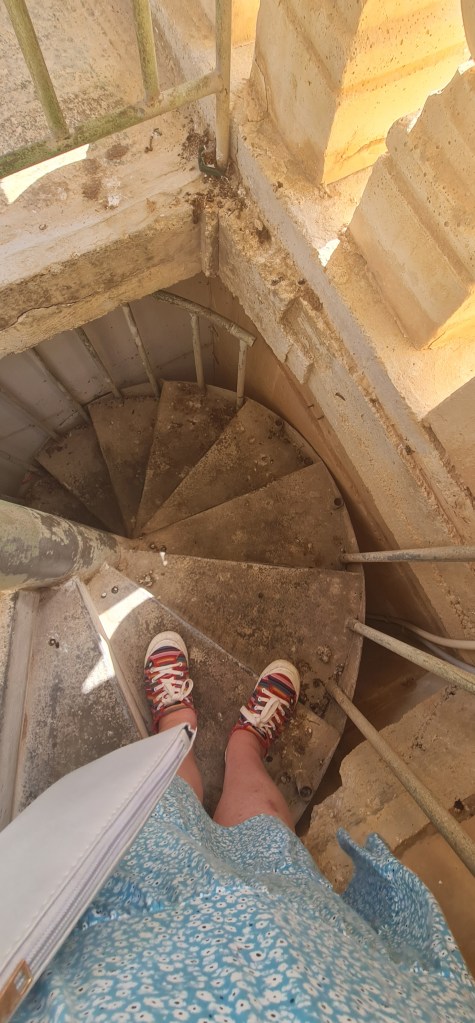 An open spiral staircase leads up to the clock mechanism, and onwards to the actual bells in the bell tower. “Quite loud” is the best description I can give, but with amazing views all round. Descending the spiral stairs is more scary, with views right down to the ground which is an awfully long way away. After my previous stairs experience from some time ago, I’m very cautious on stairs these days – especially unfamiliar or unsusal ones, thus I’m lagging far behind my friend as I descend, and she captures a photo as the updraft gives me a sort of Marilyn Munroe moment there on the stairs.