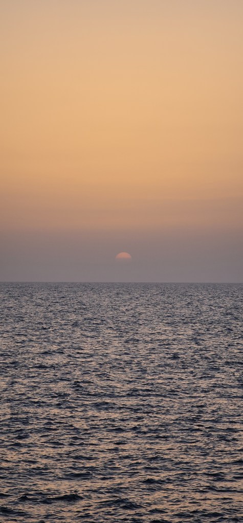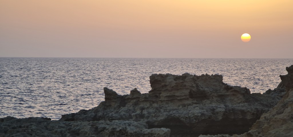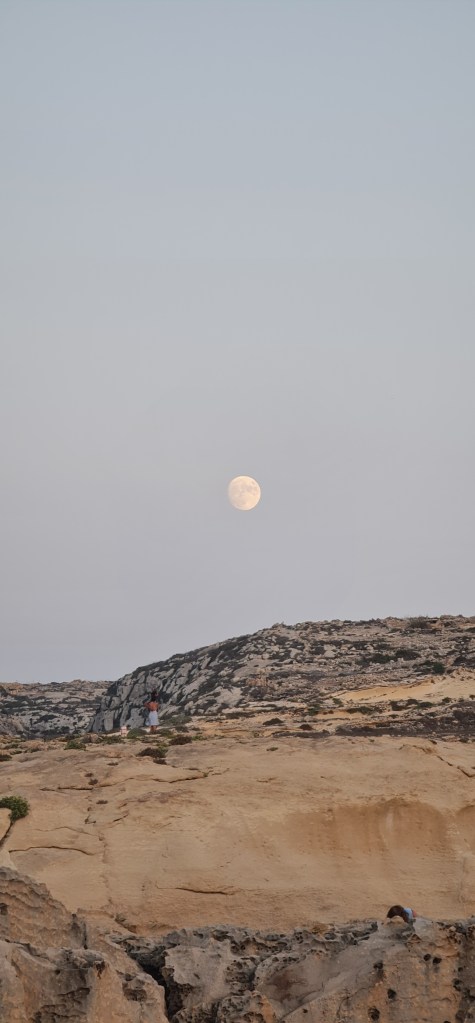 We watch sunset & moonrise on a rocky beach after eating at a restaurant nearby.