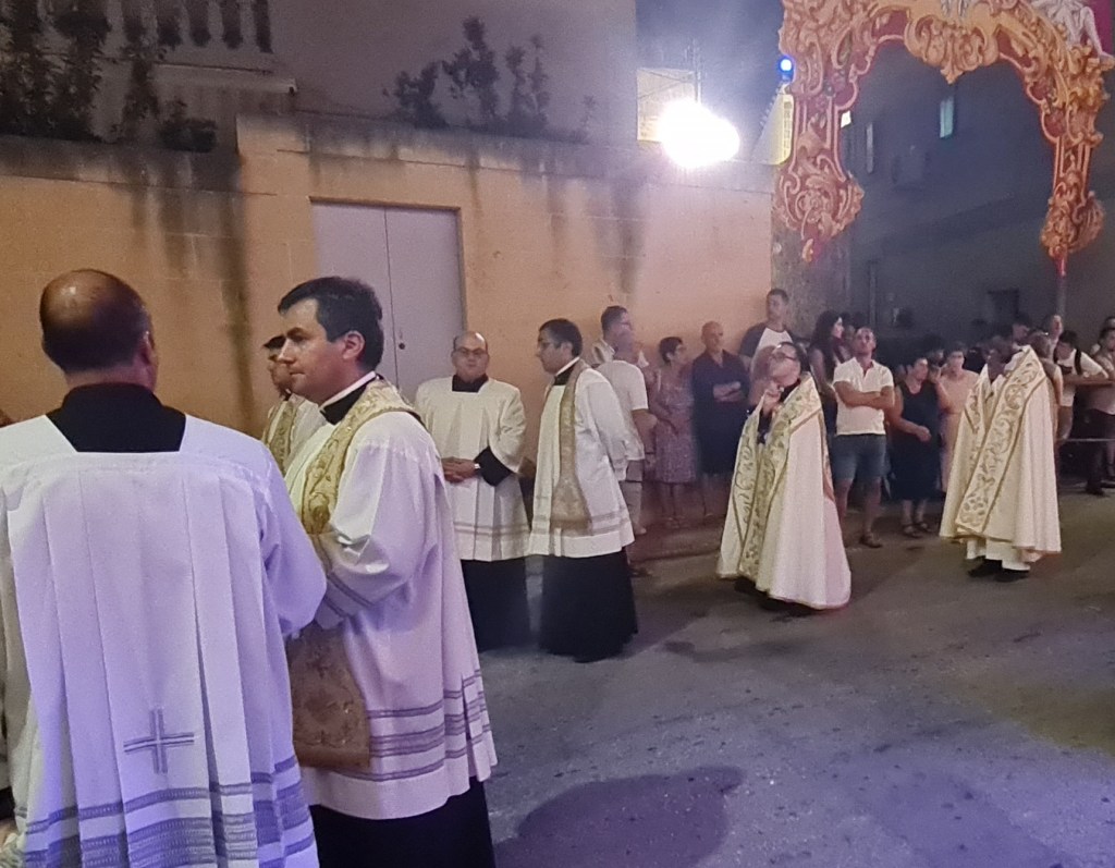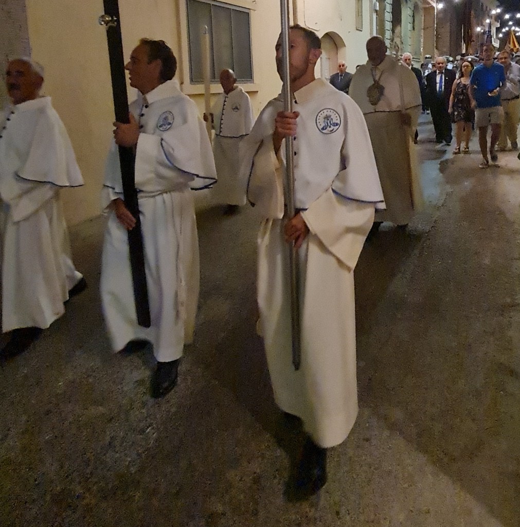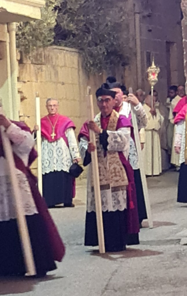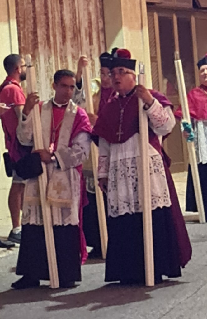 However, my favourite moment of the day comes as I am filming the procession wend its merry way through the narrow streets and past me. There I am, a “bloke in a dress” getting surprised and disapproving looks from….. blokes in dresses! I feel like asking them “What’s the difference?!” Interestingly, the “choir boys in dresses” following them look neither surprised nor disapproving, maybe still retaining some capacity for independent thought, maybe realising that there IS actually no difference (except I’m having fun).