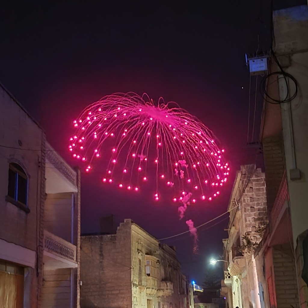 In the evening, we find ourselves in a small town having some sort of festival. Fireworks, singing, a brass band, and a procession of a strangely religious nature, yet which appears to involve considerable consumption of alcohol. All very mysterious. We’re a bit under‑dressed for this; all the locals seem to have dressed up as one might to go to the theatre in London. But I don’t mind being stared at a bit – kind of par for the course for me in girl‑mode.