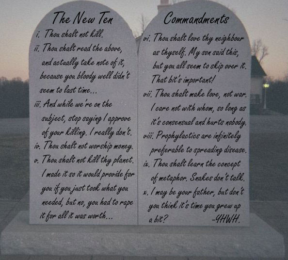 The one thing that all these scared and insecure people seem to have in common is a claim to be very religious – but only in ways which, obviously, support their narrow-minded views. To them, I offer only this: some updated Commandments since they don’t actually bother abiding by the old ones except when convenient.