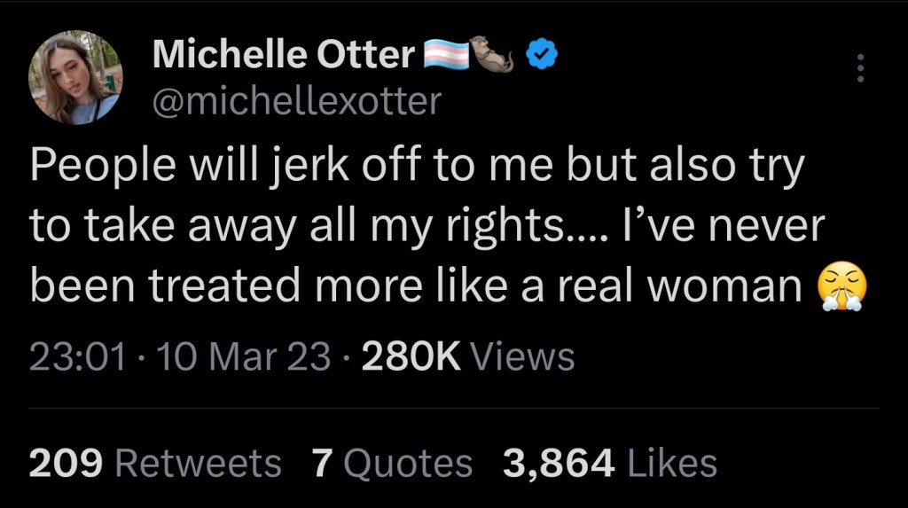 So the very same people who whinge on endlessly about government intrusion into their lives (for example by not letting them have infinite numbers of powerful guns) and “cancel culture” are perfectly happy to intrude into the lives of those who are different from themselves and, indeed, they basically intend to “cancel” such people. The very same people who endlessly bang on about how these dangerous trans people are corrupting and “sexualising” others continue to display, as they so often do, an almost fanatical interest in the contents of their underwear – in order to check that they are “biologically gender appropriate” supposidly.