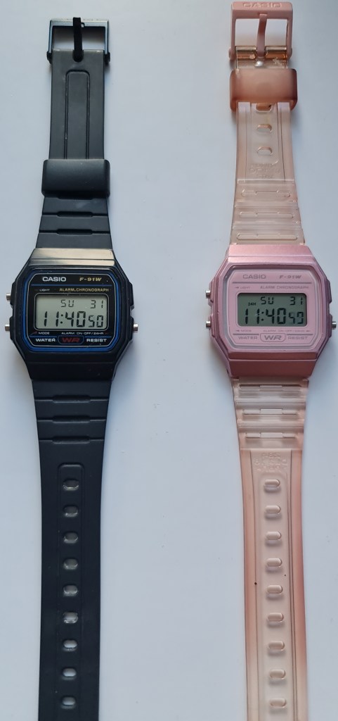 Being a creature of habit, if I’m going to wear a digital watch, I’d like to stick to just one model. (I’ve got a clockwork pocketwatch which I’d wear in girl-mode if I could work out what to attach it to – maybe I’ll have to get myself a girl-mode waistcoat with a watch pocket). And Casio, bless them, have provided just this so I have a pair of F91Ws, set within a fraction of a second of each other, and can pick the appropriate one at any time. (For the colourblind, the one on the left is black and the one on the right is pink with a semi-transparent pink strap1.)