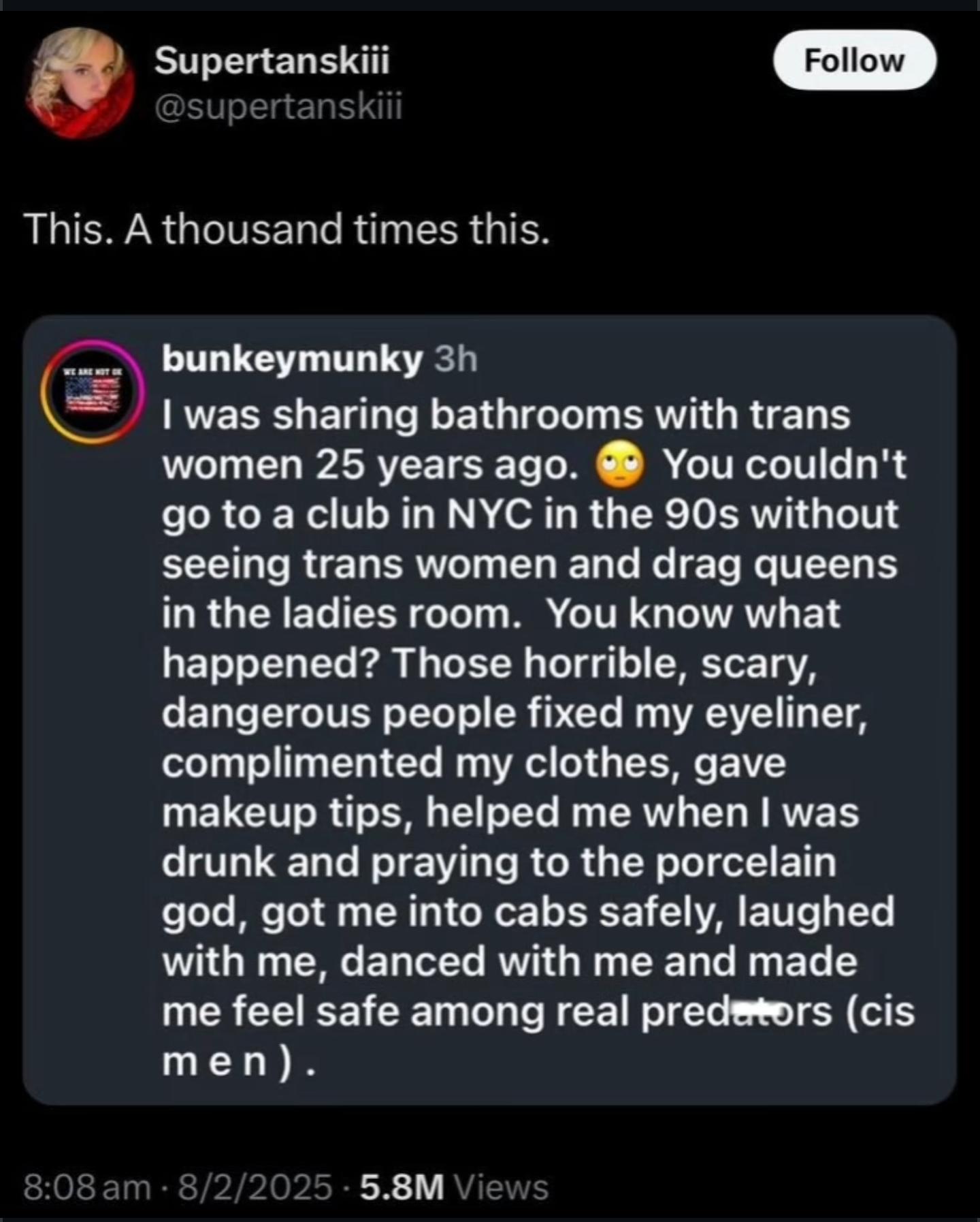 This social media post is a good illustration. The whole business with scary trans people just going about life and using rest rooms that match their presentation has not been a big issue for decades. But now it suddenly is, with the emotionally and intellectually stunted whipped up into a frenzy resulting in an unhealthy concentration upon who is using which restroom rather than how they behave, summed up by this: