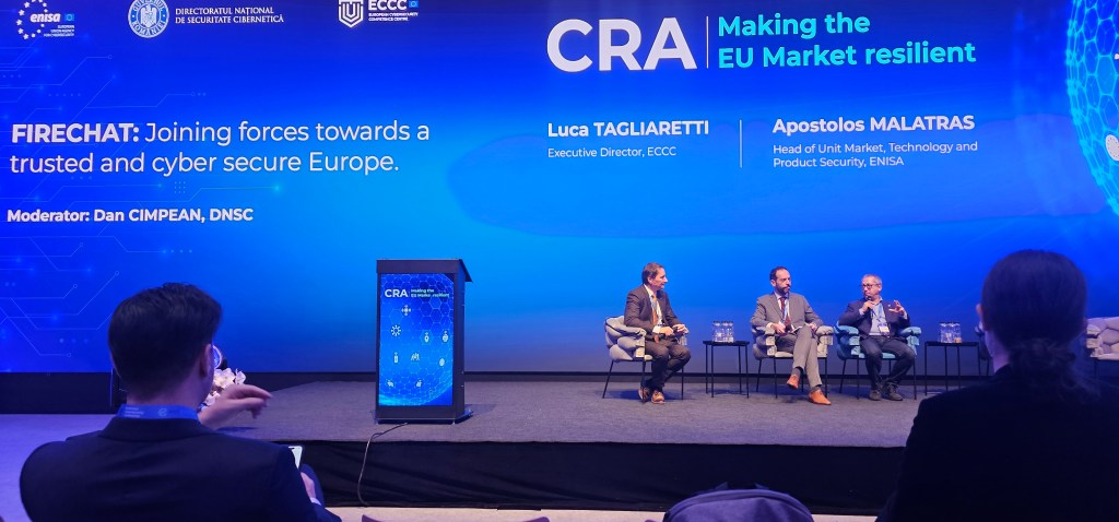 Dan Cîmpean (DNSC) chaired a fireside chat with Luca Tagliareti (ECCC) and Apostolos Malatras (ENISA) about the CRA, the context, and the impacts.